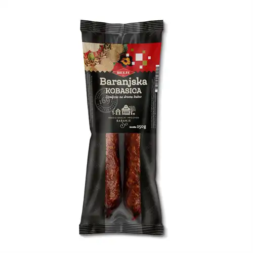 Ingredienser/sammensætning: svinekød, bordsalt, krydderier, antioxidant: natriumisoascorbat, konserveringsmiddel: natriumnitrit, starterkultur. 100 g produkt blev opnået ved at tørre 160 g frisk svinekød. Spiseligt tarm, der stammer fra oksekødskollagen Yderligere information: Pakket i en kontrolleret atmosfære Producentens adresse PC Baranjka, Bele Bartoka 33, 31300 Beli Manastir, Kroatien Produktbeskrivelse: Røget permanent pølse